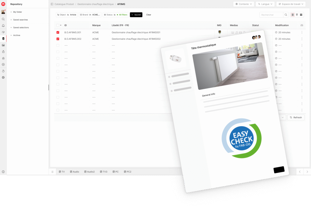 Simplicité et fluidité des processus : Centralisez vos données produits sur une seule plateforme de référence. Cela simplifie l’exportation de votre catalogue et la validation via Easy-Check by FABDIS sans besoin de développement.