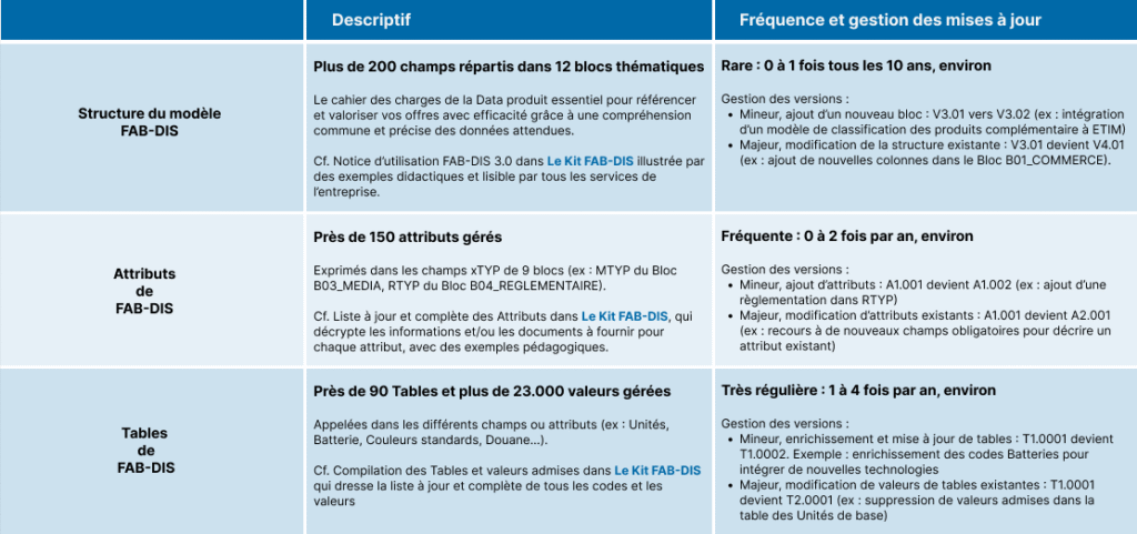 En 2023 FABDIS continue de s’adapter aux exigences du marché et fait évoluer son format en version 3.0. Ainsi il consolide sa position comme référence pour l’ensemble de la filière du bâtiment. Cette évolution facilite la maintenance du format et permet toujours une intégration fluide avec les systèmes modernes. Comme par exemple, les PIM (Product Information Management), les ERP, et les plateformes eCommerce.