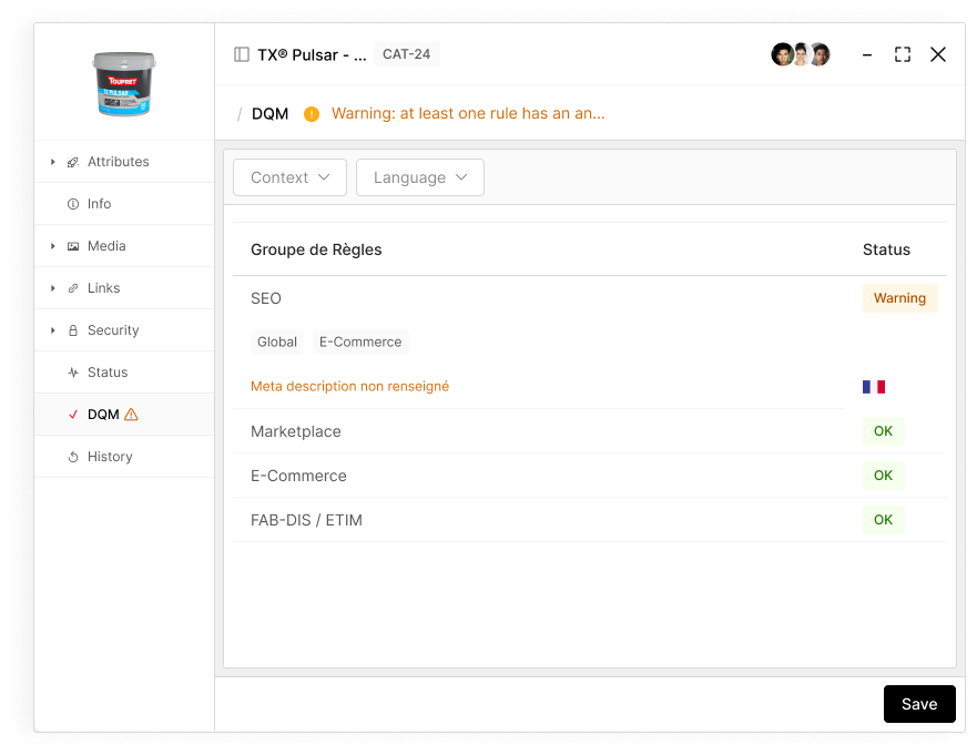 Une donnée non fiable est inutile. Mettez en place une véritable gouvernance grâce à notre module DQM (Data Quality Management). Définissez vos propres règles métier pour que la plateforme vérifie automatiquement la complétude, la cohérence et la conformité de vos informations (poids, dimensions, normes…). Nos workflows de validation (BPM) assignent les tâches aux bonnes équipes (Marketing, Technique, Réglementaire) pour assurer un contrôle rigoureux et une traçabilité totale avant diffusion .