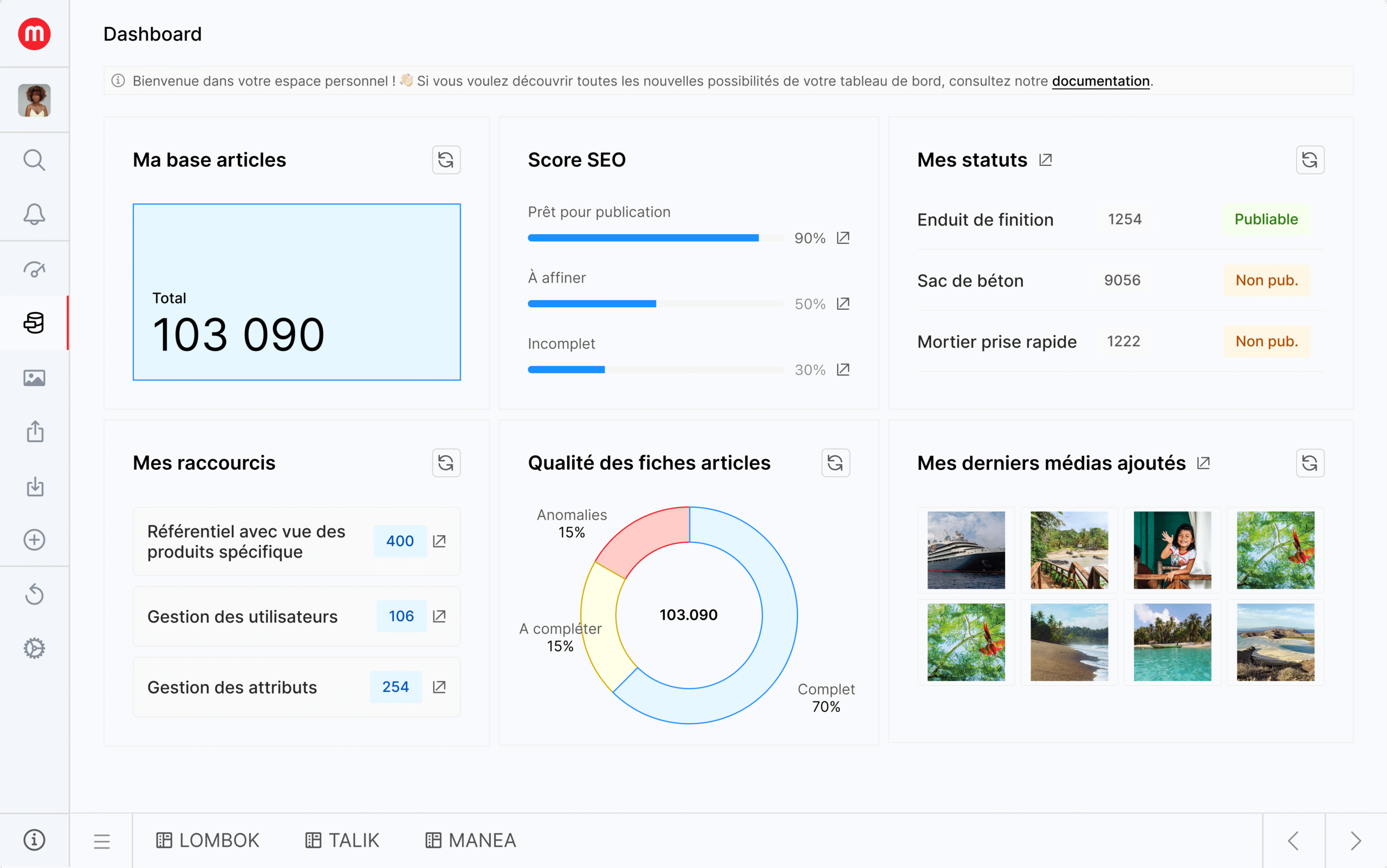 La plateforme MDM + PIM + DAM intégrée pensée pour les entreprises de services — tourisme, éducation, location, formation qui souhaitent modéliser leurs offres et industrialiser leurs publications multicanales.