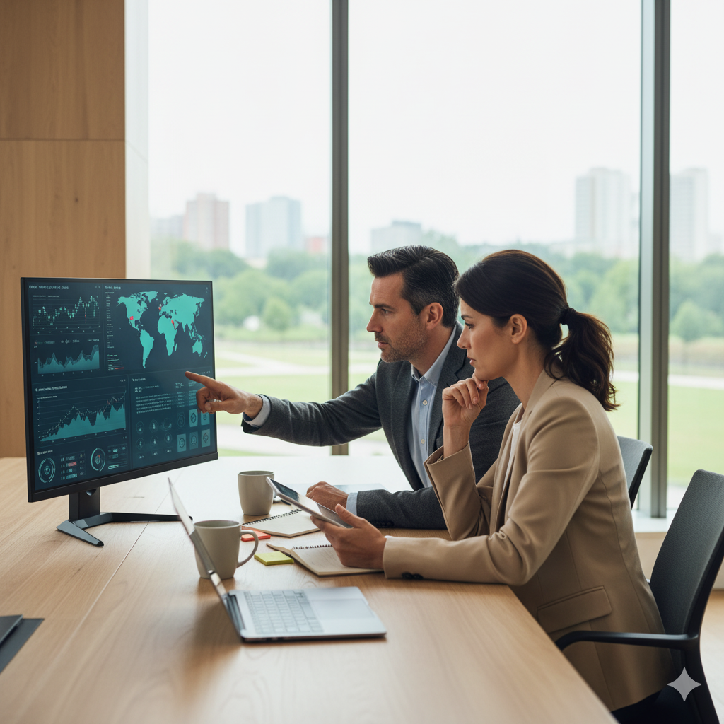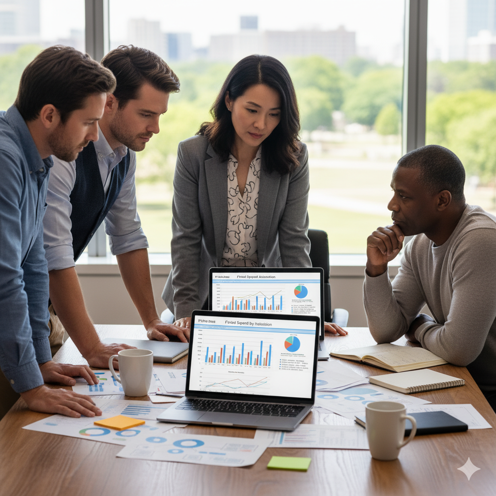 Une équipe de professionnels (Marketing, E-commerce, Achats) en pleine collaboration sur maps system